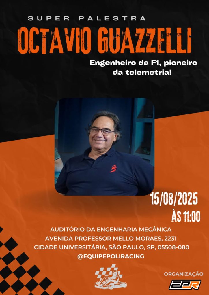 A Equipe Poli Racing promove uma palestra com Octávio Guazzelli que irá compartilhar sua trajetória, aprendizados e vivências na elite do automobilismo mundial. O evento é voltado para quem quer conhecer mais sobre automobilismo, que vivem a paixão pela engenharia de ponta e pela competição.